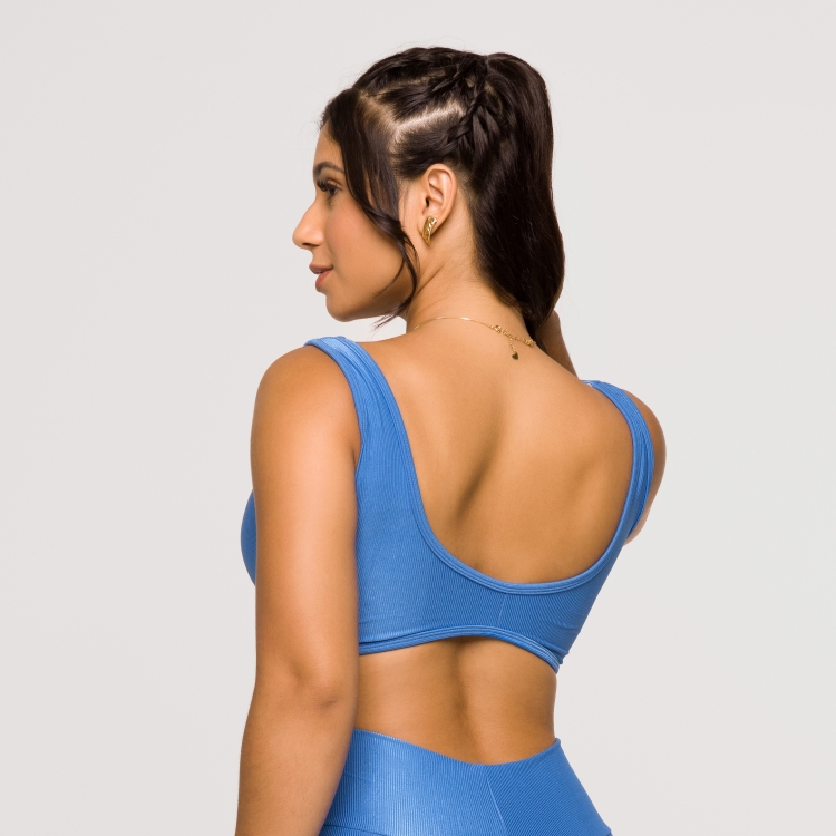 Top Feminino Azul Fitness Poliamida Academia Arco Costas Abertas